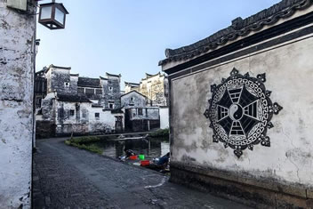 鐘池四周伸展出八條小巷,特點(diǎn)各個(gè)不同,形成了坎、艮、震、巽、離、坤、兌、乾八個(gè)部位。大公堂就在它的坎宮部位,從它的正門邊上東而去的一條十分幽深,一層層的臺(tái)階上坡,左側(cè)是綠蔭如蓋的園子,的一右側(cè)是一排排住宅的后墻,這條巷是通往村中十八廳堂之一的積慶堂的。鐘池東面條巷子很平直,100米長(zhǎng)。八條小巷似通卻閉,似連卻斷,虛虛實(shí)實(shí),猶如一張蜘蛛網(wǎng),又宛如一座迷宮。
