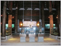 向右進(jìn)一小門是一小展廳,展示的是諸葛村村民中收集來的一些原諸葛族人在外經(jīng)營(yíng)藥業(yè)時(shí)保存下來的藥用器具,有明代的石藥碾、藥壇,有清代的藥碗、錢稱、藥匙、藥壺,還有百年老店“天一堂”清代期間制售的 “諸葛行軍散”、“臥龍丹”、“眼藥膏”!疤煲惶谩、“保仁堂”的藥店印章。